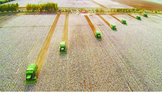 在一望无际的百万亩棉田里,驾驶员只需在装有北斗自动导航等作业系统的大马力拖拉机上,按播种要求设置好机具偏移值、作业幅宽,拖拉机就能在导航系统引导下按规划路线自动驾驶和精准、精量播种。即使在忙碌的采摘季节,也不需要大量的“采棉工”。新疆农业部门发布的2020年数据显示,新疆棉花机械采摘率已达69.83%,其中北疆95%的棉花是通过机械采摘的。