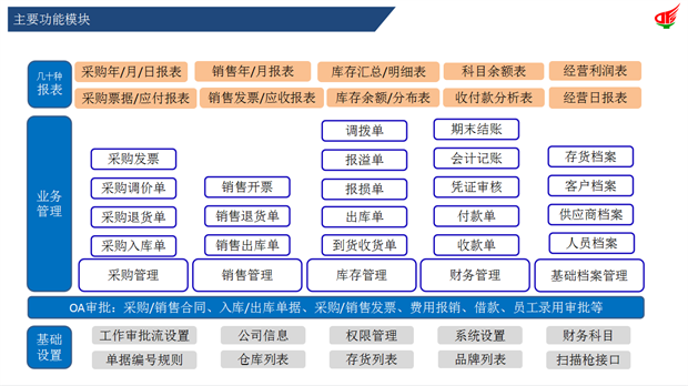 解决企业在进货、销售、存储多个环节的账目混乱,库存不准,信息反馈不及时等问题;系统集采购、销售、库存管理和应收、应付款管理为一体,提供订单、采购、销售、退货、库存、往来发票、往来账款、业务员等的管理。