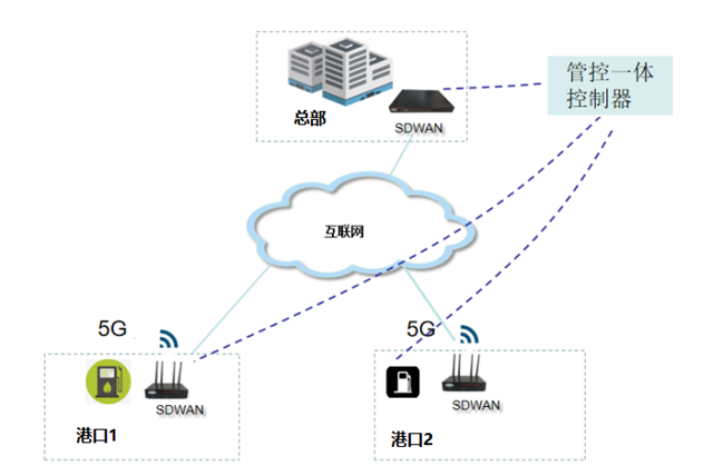 为加快北部湾北部湾智慧港口5G网络和信息化建设进程,东方森太协助广西移动钦州分公司助力广西北部湾外轮理货有限公司提供SD-WAN解决方案。通过中国移动高质量的5G网络,为广西北部湾外轮理货有限公司提供稳定可靠的基础网络,并通过SD-WAN产品在基础网络上搭建VPN专网,并同时利用5G网络,高延迟,大带宽的特性,充分保障网络的可靠性。