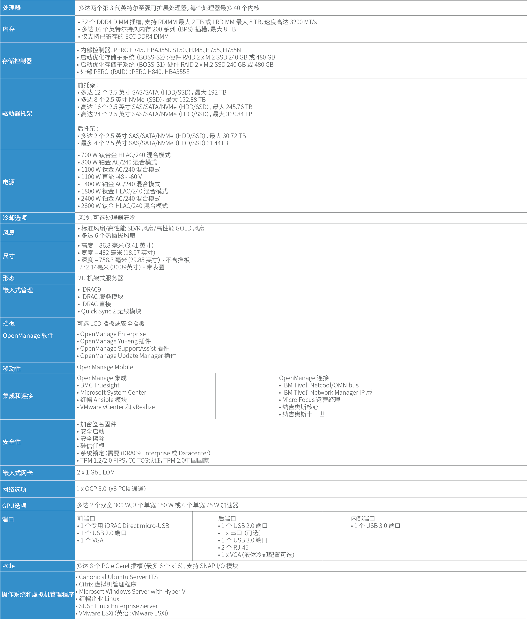 • 可选直接液冷支持,满足高瓦数处理器的需要