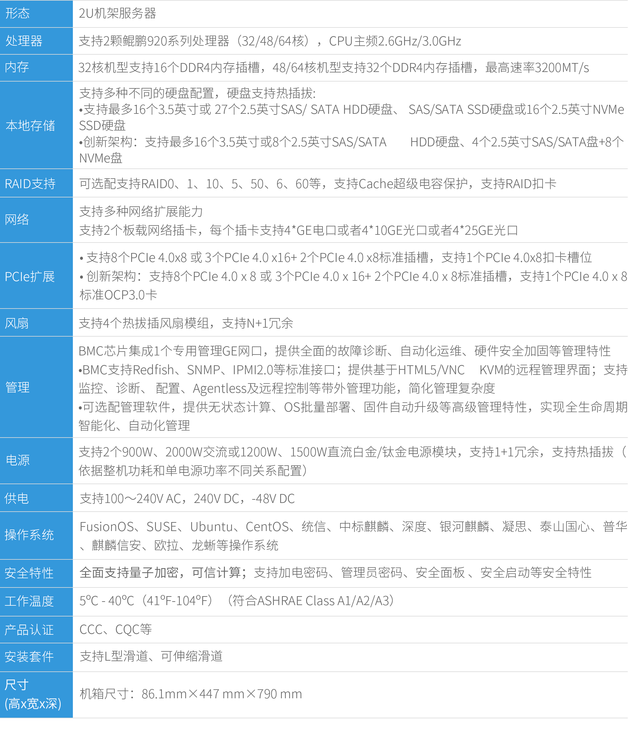 • 2U空间支持2颗鲲鹏920处理器,单CPU最高支持64个计算核心 • 支持16/32条DDR4内存插槽,最大内存容量可达4TB,满足大容量内存应用需求 • 最大支持27个2.5英寸硬盘,或16个3.5英寸硬盘,或16个全NVMe SSD,或4个2.5英寸硬盘+8个NVMe盘 • 支持8个PCIe标卡槽位,2个灵活IO网卡槽位,支持RAID扣卡,可扩展性强