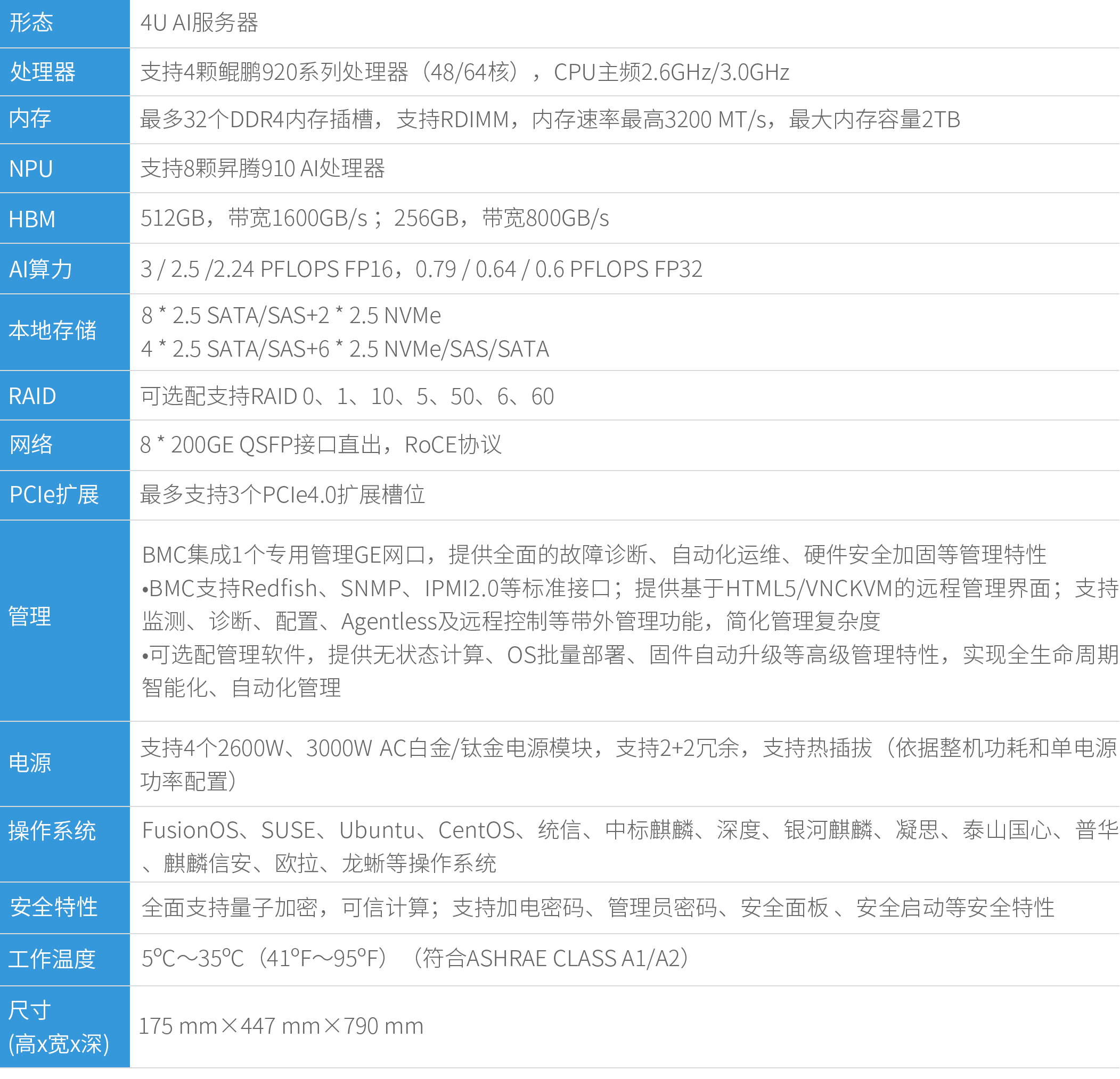 • 支持8颗昇腾910 AI处理器,4U高度最高提供3 PFLOPS FP16超强算力,0.79 PFLOPS FP32业界领先算力